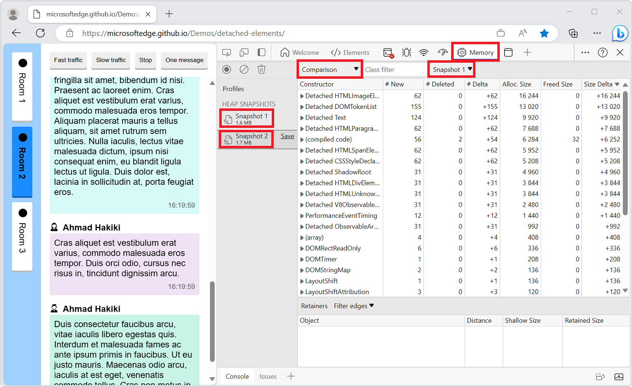 Una de las herramientas más poderosas para detectar memory leaks en aplicaciones web es el conjunto de herramientas de desarrollo integradas en los navegadores. En particular, las DevTools ofrecen funcionalidades específicas para monitorear el uso de memoria. Para detectar un memory leak, podemos utilizar la pestaña "Memory" o "Memoria" en las DevTools, donde podemos observar el crecimiento inesperado del consumo de memoria durante ciertos períodos de tiempo o acciones del usuario. Por ejemplo, si notamos un aumento constante en el uso de memoria después de cargar una página o realizar ciertas interacciones, esto podría indicar un posible memory leak. Además, las DevTools suelen proporcionar herramientas para realizar análisis más detallados, como la toma de perfiles de memoria y la visualización de la retención de memoria por parte de objetos y elementos del DOM. A continuación, se muestra una captura de pantalla de las DevTools con un ejemplo de un memory leak, donde se puede observar un aumento constante en el uso de memoria después de ciertas acciones en la página web.