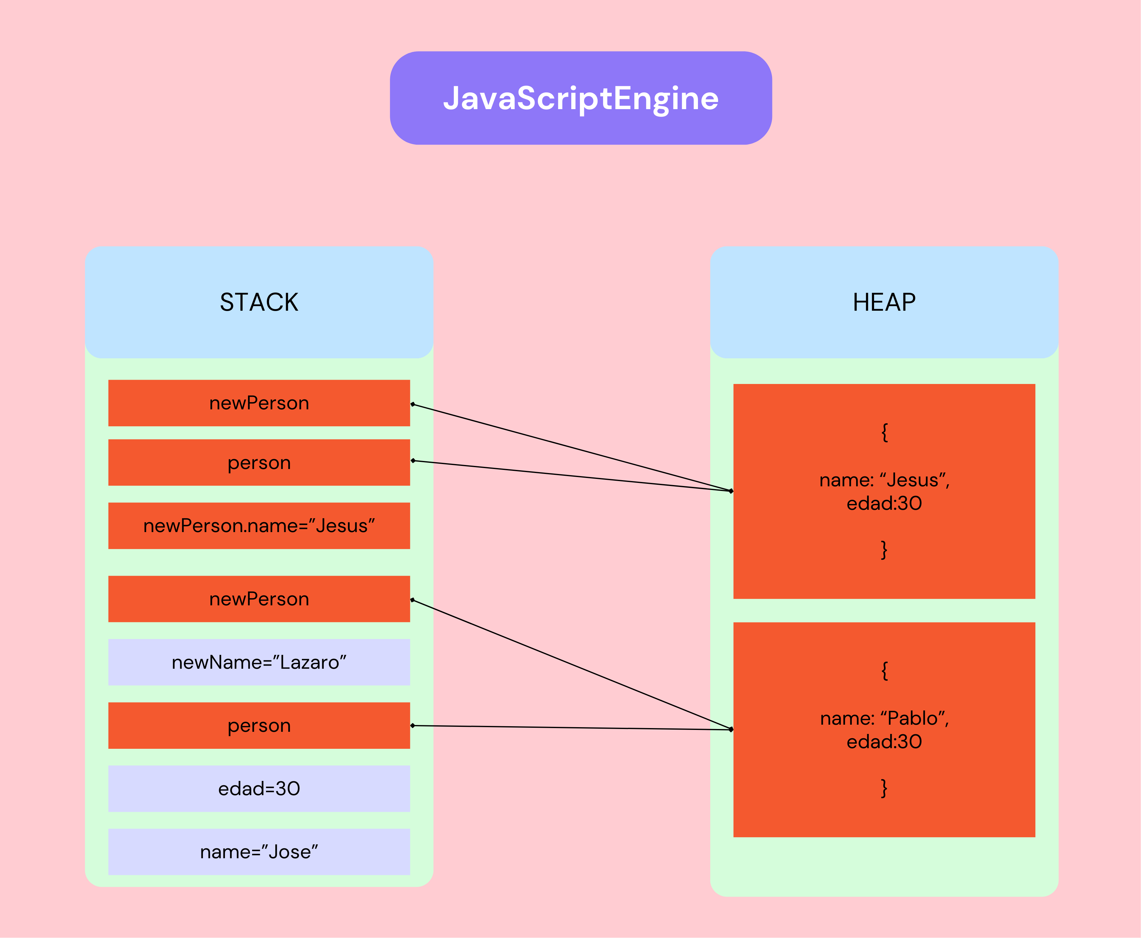 Tipos de Referencia: Se almacenan en el montón (heap) y se accede a ellos a través de referencias.